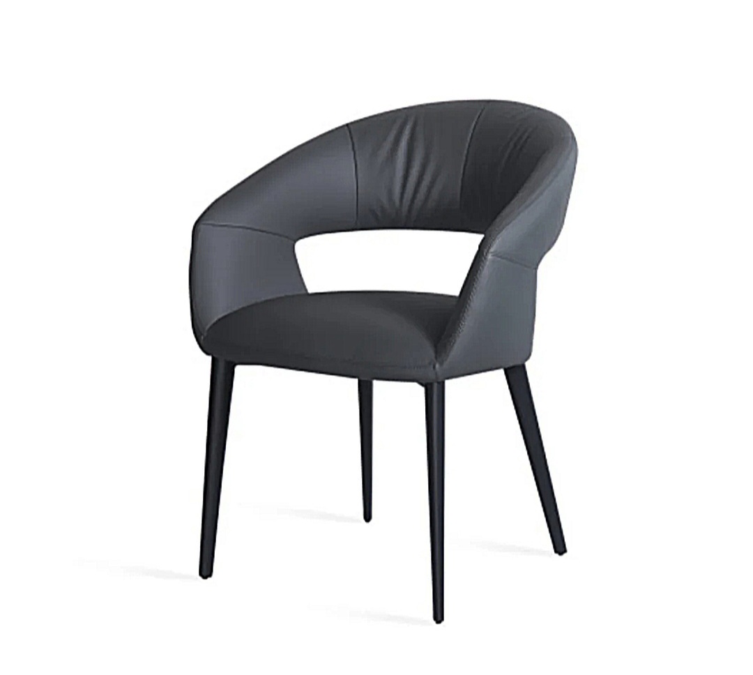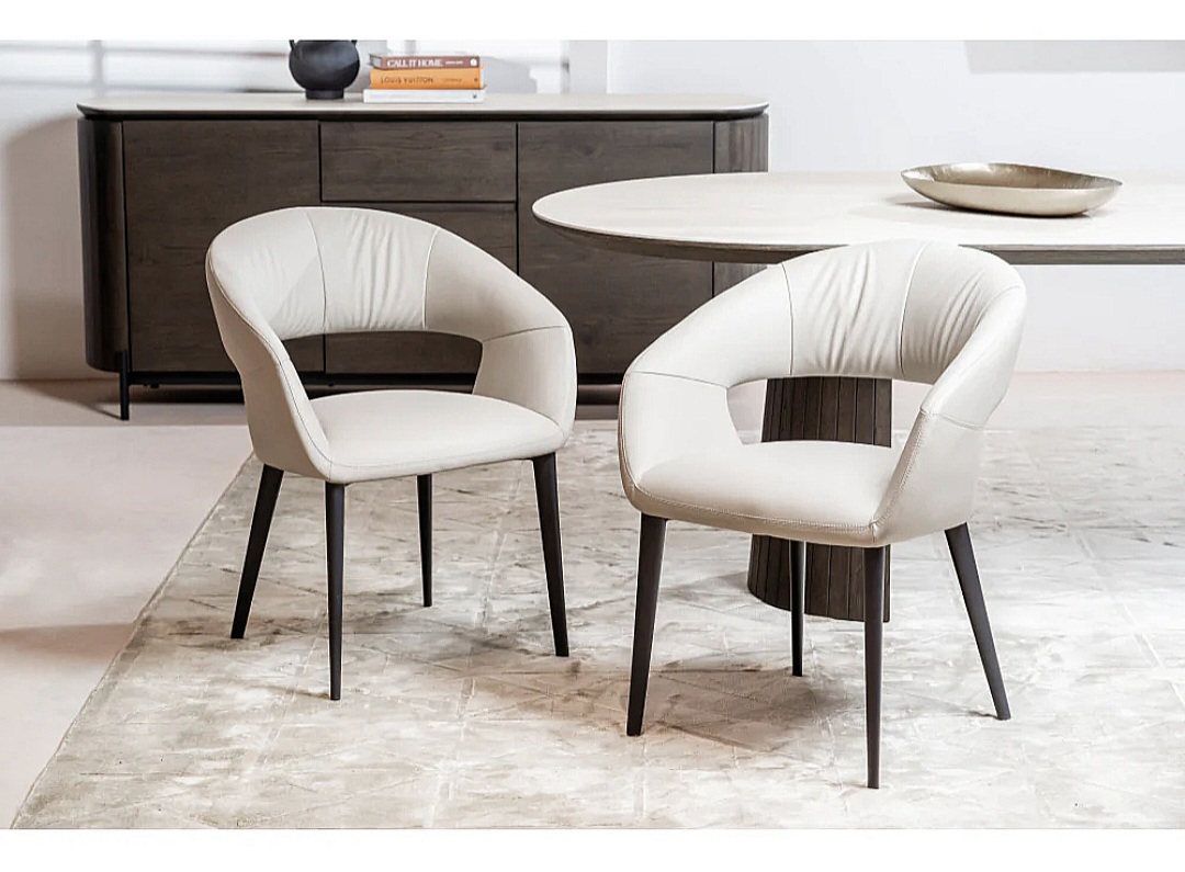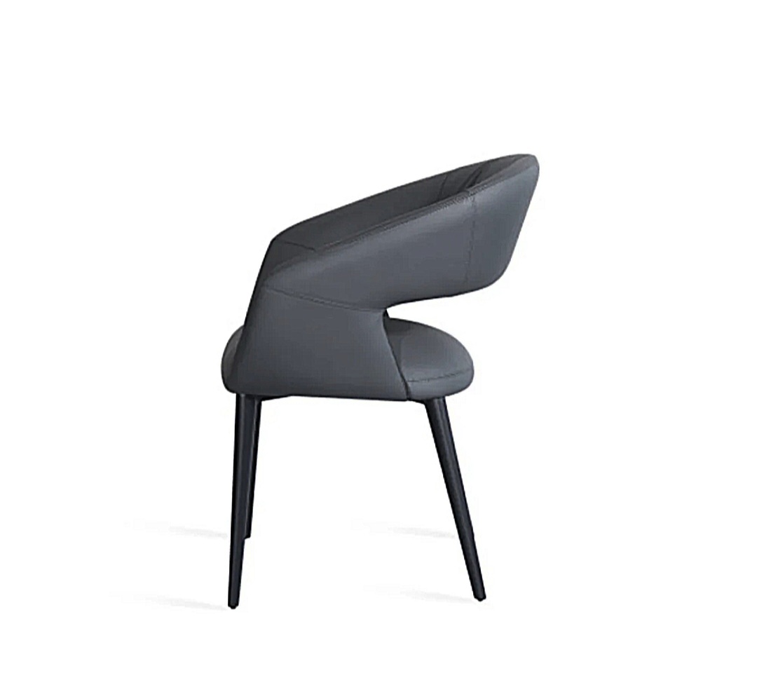 A szék félköríves, körül ölelő háttámlája elegáns és ergonomikus, amely természetes módon támasztja meg a hátat, így akár hosszabb étkezések, baráti beszélgetések vagy üzleti vacsorák alkalmával is komfortos marad. A karfák finom íve és a háttámla enyhe döntése megteremti azt a „hotel-lounge” érzést, amely minden enteriőrt exkluzívvá varázsol.