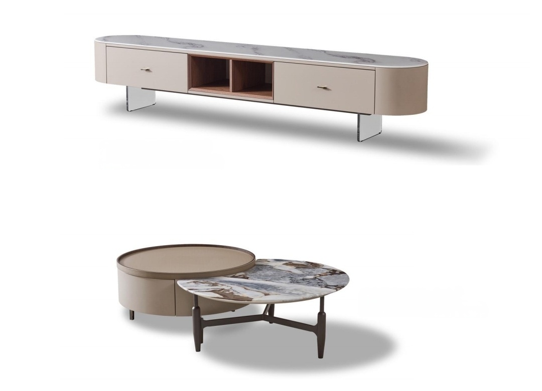 BALZANO MONTEO TV szekrény és dohányzóasztal – bőrhatású bevonattal, márvány tetővel