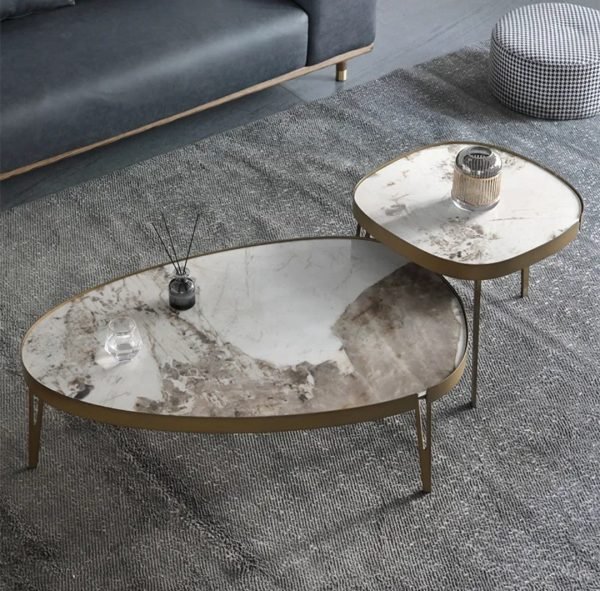 Modern dohányzóasztal szett rozsdamentes acél lábakkal , szinterezett kő lappal.