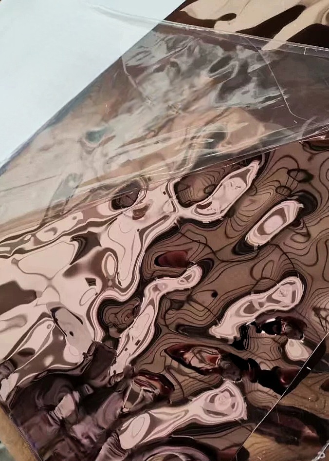 A Rose Gold 3D Vízfodros Dekorpanel a modern enteriőrök egyik leglátványosabb, legexkluzívabb burkolata. A panel prémium rozsdamentes acélból készül, melynek felületén mély, hullámzó „vízfodros” 3D mintázat fut végig. Ez az organikus, dinamikus felület a fényt gyönyörűen töri meg, így a fal vagy mennyezet szinte mozgásban lévő, élettel teli hatást kelt.